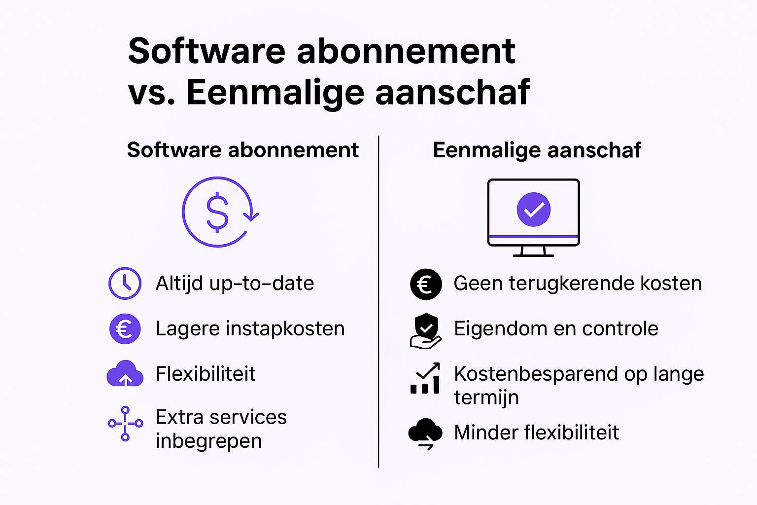 - Bij een abonnement betaal je periodiek (maandelijks of jaarlijks) om de software te gebruiken. Vaak zijn updates, cloud functionaliteiten en support inbegrepen bij het abonnement.