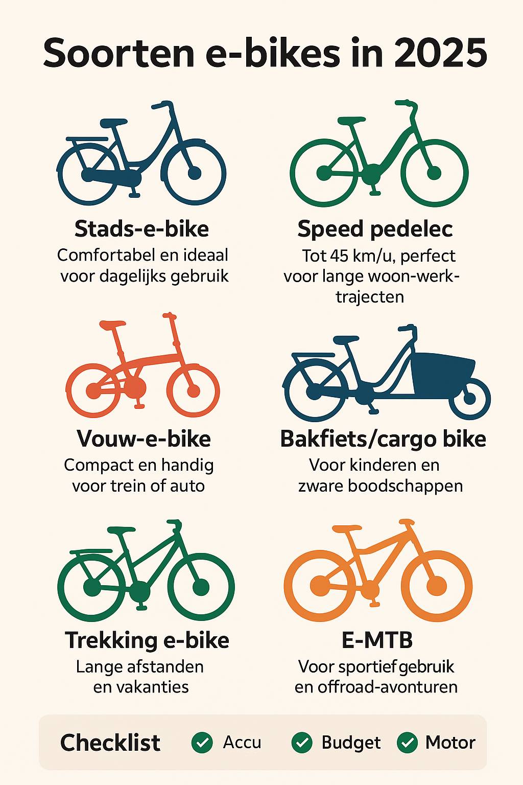 Anno 2025 zijn er enorm veel soorten e-bikes verkrijgbaar. Van snelle speed pedelecs tot praktische bakfietsen en sportieve trekking-modellen: er is voor iedereen een geschikte elektrische fiets. Door goed te kijken naar je gebruik, budget en persoonlijke voorkeuren vind je eenvoudig de e-bike die perfect bij je past. Wil je meer tips voor het onderhouden van je e-bike? Kijk dan eens bij ANWB e-bike informatie.